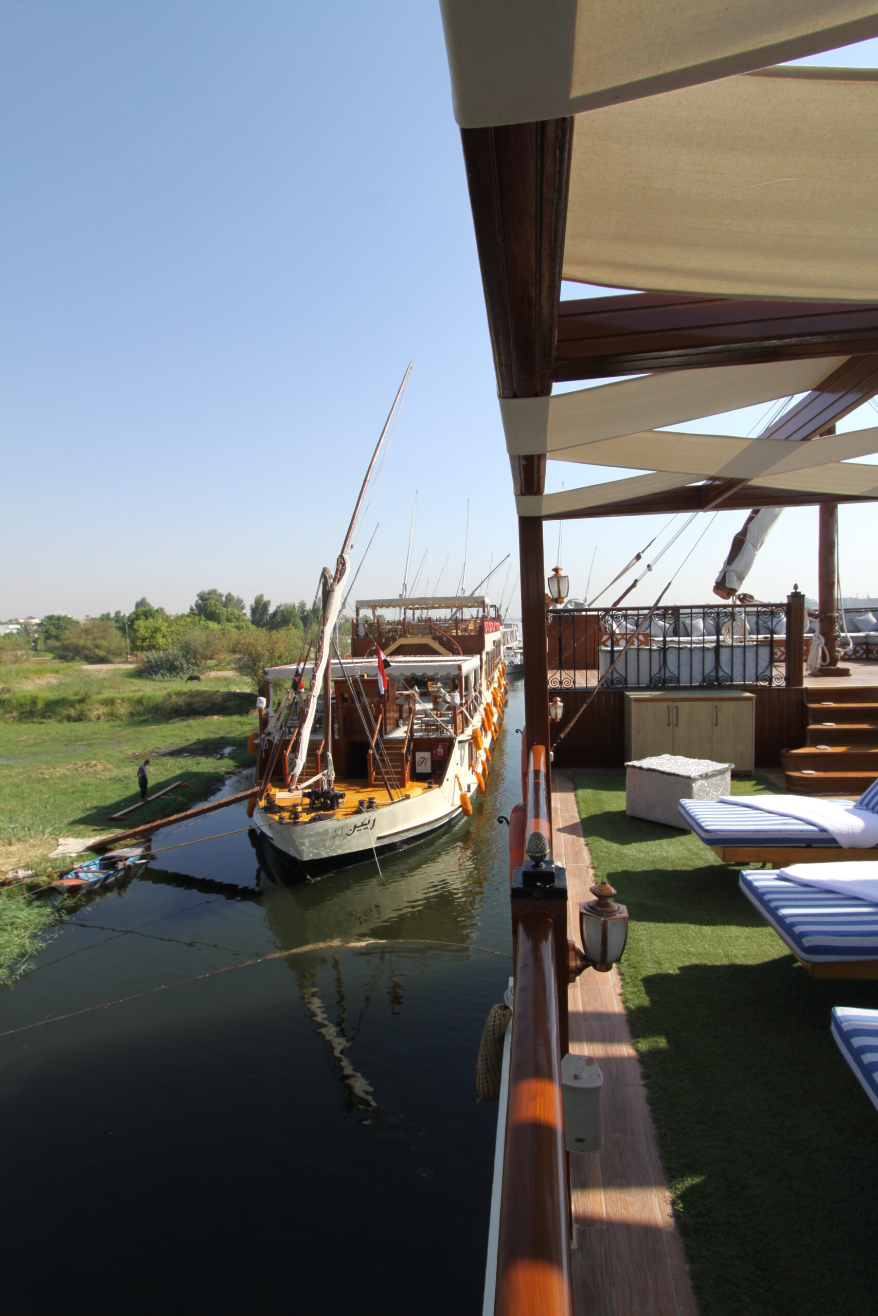 From the moment you step aboard the dahabiya, the tone is set. Inspired by the elegant royal sailing vessels of the 19th century, the boat combines traditional craftsmanship with discreet modern luxury. Soft lantern light, polished wood, and panoramic decks create an atmosphere of understated elegance, while the gentle movement of the river instantly slows the rhythm of time.